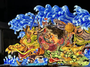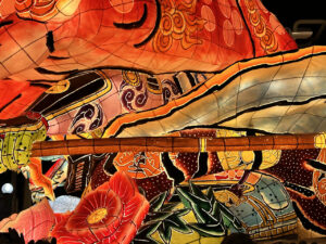・和紙に彩色して内側から灯す構造。絵柄が光によって立体的に浮かび上がる。